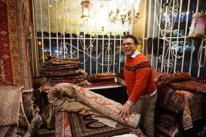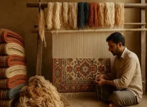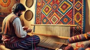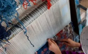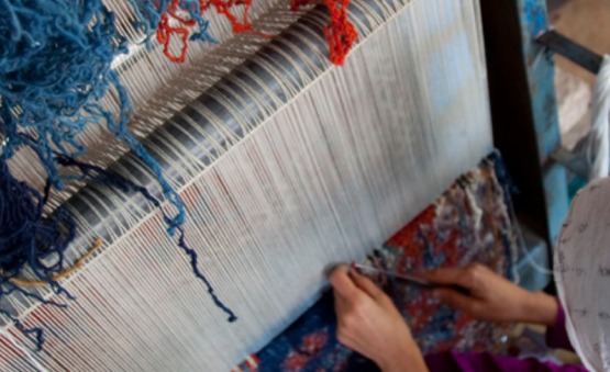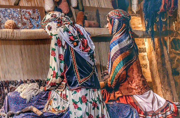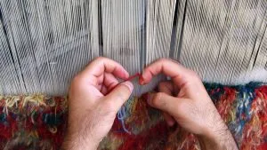 Iranians enjoy a global reputation in carpet weaving, and the carpet weavers of Fars, located in the south-west of Iran, are among the most prominent. Wool for the carpets is shorn by local men in spring or autumn. The men then construct the carpet loom – a horizontal frame placed on the ground – while the women convert the wool into yarn on spinning wheels. The colours used are mainly natural: reds, blues, browns and whites produced from dyestuffs including madder, indigo, lettuce leaf, walnut skin, cherry stem and pomegranate skin. The women are responsible for the design, colour selection and weaving, and bring scenes of their nomadic lives to the carpet. They weave without any cartoon (design) – no weaver can weave two carpets of the same design. Coloured yarn is tied to the wool web to create the carpet. To finish, the sides are sewn, extra wool is burned away to make the designs vivid, and the carpet is given a final cleaning. All these skills are transferred orally and by example. Mothers train their daughters to use the materials, tools and skills, while fathers train their sons in shearing wool and making looms.