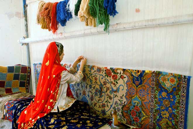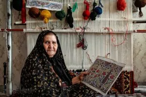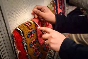 Long a centre for fine carpets, Kashan has almost one in three residents employed in carpet-making, with more than two-thirds of the carpet-makers being women. The carpet-weaving process starts with a design, elaborated from among a series of established styles, including motifs such as flowers, leaves, branches, animals and scenes taken from history. Woven on a loom known as a dar, the warp and woof are of cotton or silk. The pile is made by knotting wool or silk yarns to the warp with the distinctive Farsi knot, then held in place by a row of the woven woof, and beaten with a comb. The Farsi weaving style (also known as asymmetrical knotting) is applied with exemplary delicacy in Kashan, so that the back side of the carpet is finely and evenly knotted. The colours of Kashan carpets come from a variety of natural dyes including madder root, walnut skin, pomegranate skin and vine leaves. The traditional skills of Kashan carpet weaving are passed down to daughters through apprenticeship under instruction from their mothers and grandmothers. Apprenticeship is also the means by which men learn their skills of designing, dyeing, shearing, loom-building and tool-making.