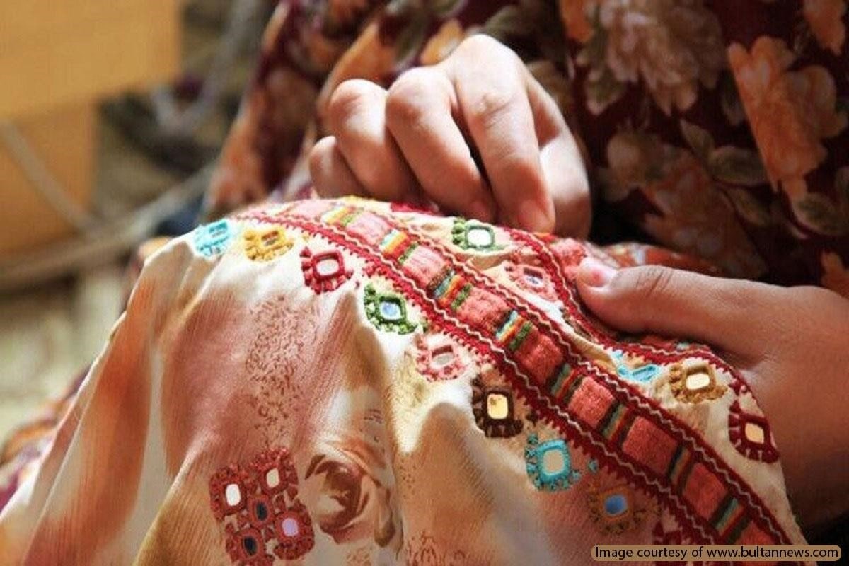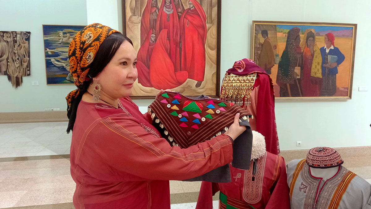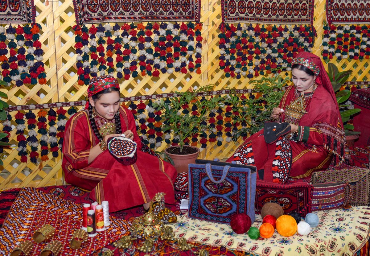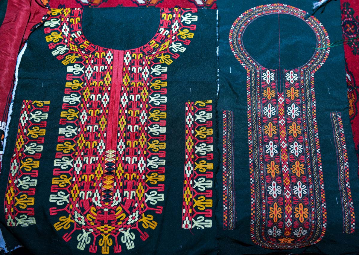 Turkmen-style needlework is a decorative applied art used on the national dress of people of all genders and ages in Turkmenistan and Iran. In both countries, Turkmen-style needlework begins with the preparation of thin silk threads that are intertwined in three layers and twisted into a single thread, then straightened with a large needle. This unique technique gives the thread a shine. For the most common needlework style, a series of loops are created by piercing the fabric with a thin needle and holding the previous loop with the thumb of the other hand. There are also other needlework styles that vary according to the region. There is no age limit, and young girls traditionally learn the needlework from their mothers and grandmothers. In rural areas, the patterns used reveal the territorial identity of the needlewomen. They are also used to symbolize love, friendship, nature and strength. The needlework is used on wedding clothes, in clothing for funerals and cultural events, and as decorative parts of ordinary clothing, such as scarves, coats, pants, shawls and accessories.