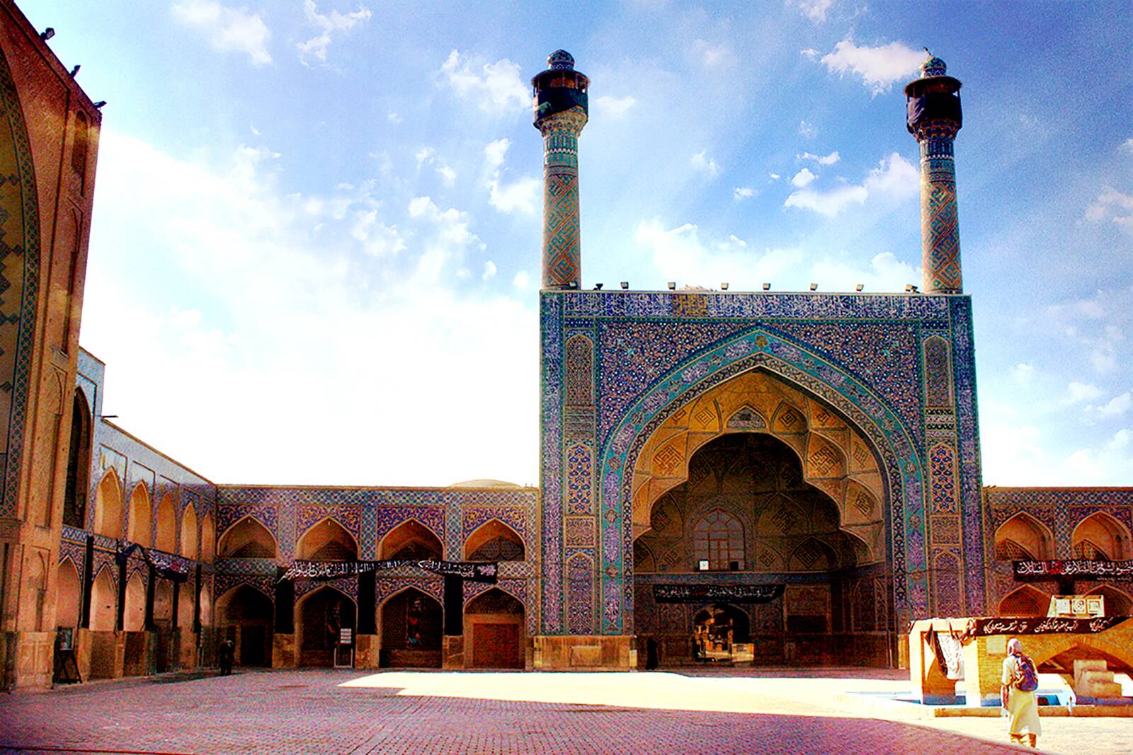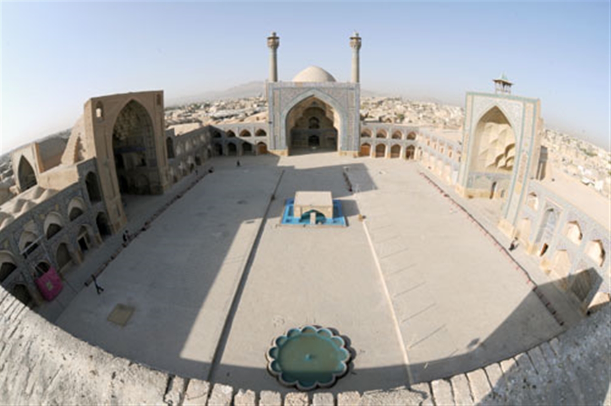 Masjed-e Jāme’ is the oldest Friday (congregational) mosque in Iran, located in the historical centre of Isfahan. The monument illustrates a sequence of architectural construction and decorative styles of different periods in Iranian Islamic architecture, covering 12 centuries, most predominantly the Abbasid, Buyid, Seljuq, Ilkhanid, Muzzafarid, Timurid and Safavid eras. Following its Seljuq expansion and the characteristic introduction of the four iwans (Chahar Ayvān) around the courtyard as well as two extraordinary domes, the mosque became the prototype of a distinctive Islamic architectural style.